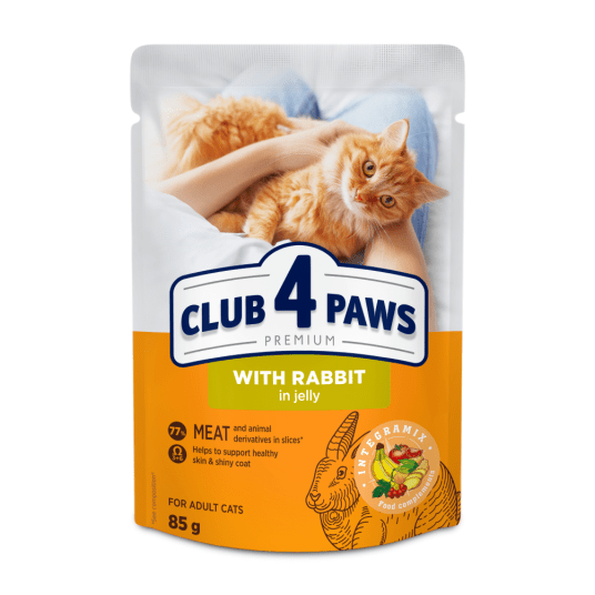 CLUB 4 PAWS PREMIUM "Z KRÓLIKIEM W GALARETCE". PEŁNOPORCJOWA KARMA W SASZETKACH DLA DOROSŁYCH KOTÓW.