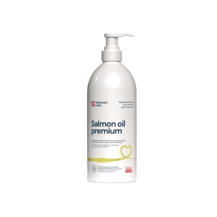 Wysokiej jakości olej pozyskiwany z łososia klasy premium, wspierający zdrowie skóry, sierści i ogólne samopoczucie psa. Bogaty w naturalne kwasy tłuszczowe Omega-3 (EPA i DHA), suplement ten pomaga w utrzymaniu lśniącej sierści, zdrowej skóry, elastycznych stawów i silnego układu odpornościowego. Odpowiedni dla psów wszystkich ras i rozmiarów, szczególnie tych wymagających wsparcia w przypadku suchej skóry, matowej sierści lub problemów związanych ze stanami zapalnymi.