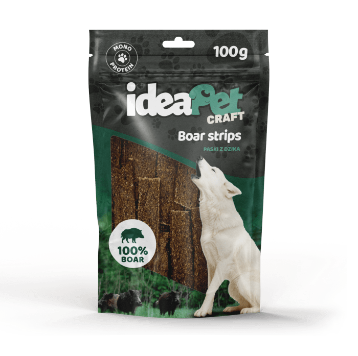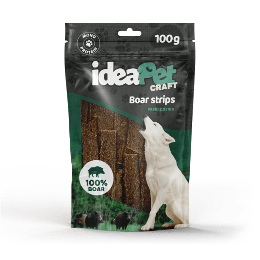 Craft Boar Strips to naturalny przysmak z dzika. Dzięki prostemu składowi i lokalnej produkcji zapewnia pełną kontrolę jakości oraz bezpieczeństwa. To produkt rzemieślniczy, opracowany z myślą o szczęściu psów i zadowoleniu ich opiekunów.